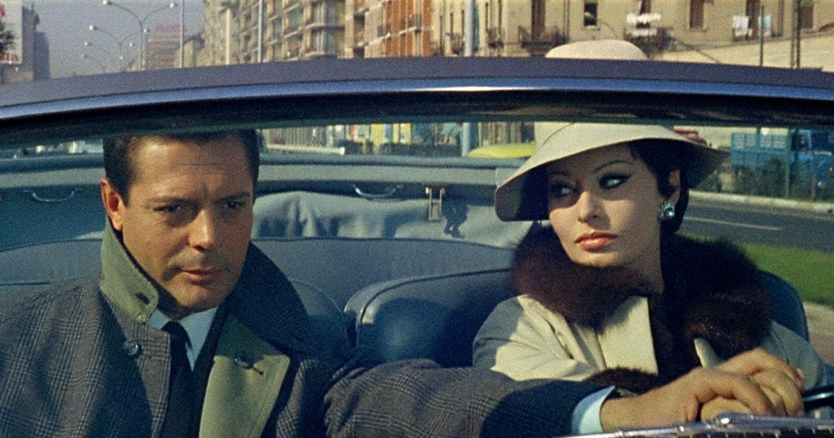 Ieri, oggi, domani (1963) porta agli Oscar la collaborazione di Marcello Mastroianni con Sophia Loren e Vittorio De Sica. Tre episodi, scritti (anche) da Eduardo de Filippo (Adelina, a Napoli), Alberto Moravia (un suo adattamento per Anna, a Milano) e Cesare Zavattini (Mara, a Roma). Anatomia di un duo: delicato e sornione, Marcello dolcemente accompagna l’esuberanza di Sophia. Carmine, Renzo e Augusto sono l’uomo che si aggiusta, con esiti anche tragicomici, di fronte alla donna che cambia. Marito soffocato dalla contrabbandiera che lo sfinisce di gravidanze per evitare la galera (1). Intellettuale senza una lira usato e gettato dalla ricca annoiata (2). Cliente dell’escort roso dal desiderio, nella gloria dello spogliarello che è una vetta nella carriera di entrambi (3). Marcello, spalla ma non succube, disincantato e autoironico, celebra il suo charme ridendoci sopra. Francesco Costantini