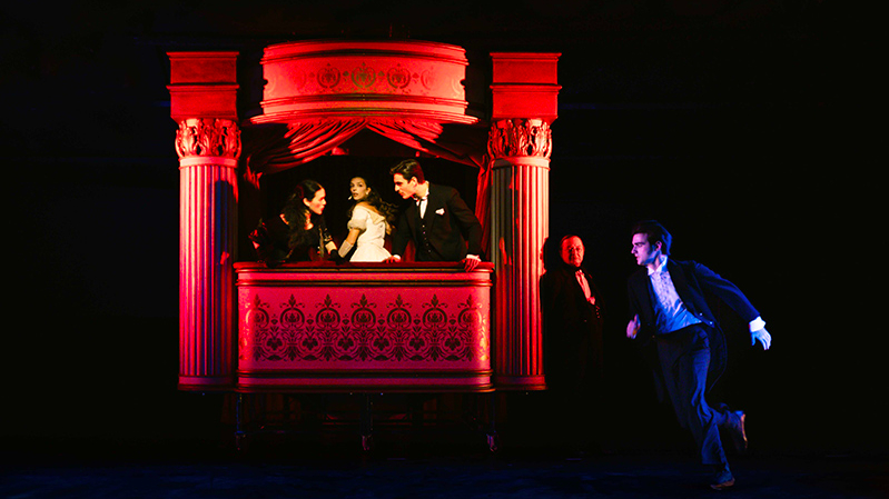 Lo spettacolo ha al suo centro un grande palchetto – magistralmente realizzato da Federico Biancalani e Nadia Baldi – inizialmente posizionato in modo da attivare l’azione attraverso lo sguardo evocatore di Armando (uno strabiliante e magnetico Alberto Marcello) che vi vede all’interno prima ancora che riesca a farlo lo spettatore, facendo comparire col suo guardare la figura eterea di Marguerite (Anna Manella, semplicemente perfetta) che da quel palchetto non esce mai, rimanendo intrappolata in una cornice enunciazionale materiale che è già violenta narrazione nel suo solo essere in scena. Il palchetto è luogo dello sguardo, luogo del desiderio, punto significante nevralgico dello spazio teatrale (e in questo caso, nello spazio teatrale) dove il guardare si nega col buio e per questo si amplifica, diventando fulcro del desiderio scopico.