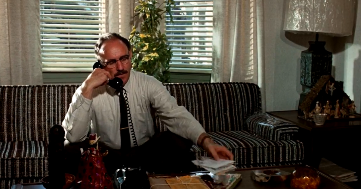 Gli indizi del delitto sono nascosti in piena vista, in un’ostentata esposizione anti-noir che si tiene in quello spazio senza chiaroscuri, nel quale è fosco anche ciò che è illuminato ed è minaccioso ed equivoco anche ciò che è conclamato. Imprendibile resta infatti quella frase, anche se via via chiarita sillaba per sillaba, depurata dalle distorsioni, disambiguata nell’articolazione dei suoni. Quelle parole aprono un varco in una coltre apparentemente impenetrabile: quella che ammanta la vita asettica dell’esperto di intercettazioni Harry Caul, interpretato da Gene Hackman, fuoriclasse dalla scorza tagliente.