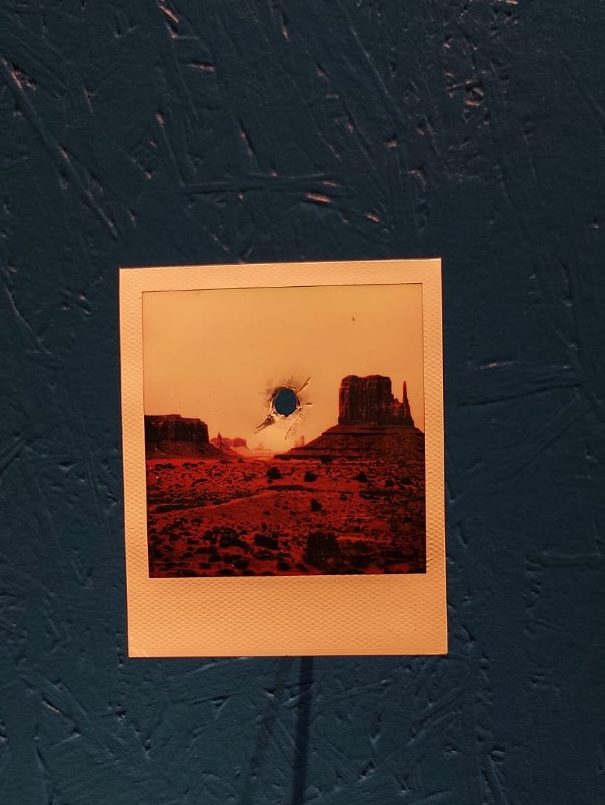 Il foro di proiettile nella Polaroid che ci mostra la Monument Valley è molto eloquente. Sembra sottolineare la minaccia che costantemente si percepisce in questi ultimi tempi, è così?