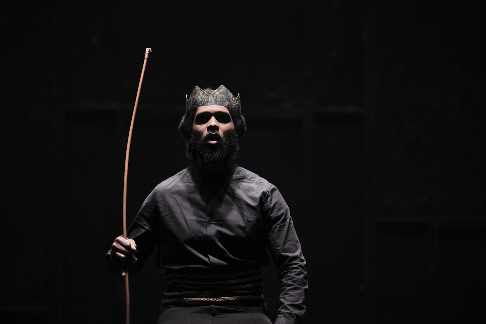 Edipo è un Macbeth avant la lettre: protagonista dal destino infausto, segnato dal sangue, che oltrepassa il limite e nel riconoscimento della propria colpa trova la rovina. In Tragùdia, come già in Macbettu, il cuore pulsante è corale: canti estatici sostenuti da un’elettronica esplosiva costruiscono un ritmo incalzante, mentre i pannelli delle quinte si trasformano in rampe. Gli eventi precipitano: Giocasta scopre d’essere madre e moglie e si uccide; Edipo, sconvolto, si acceca. L’accecamento, non mostrato ma evocato da grida nel buio – nel nero – traghetta alla seconda parte dello spettacolo.